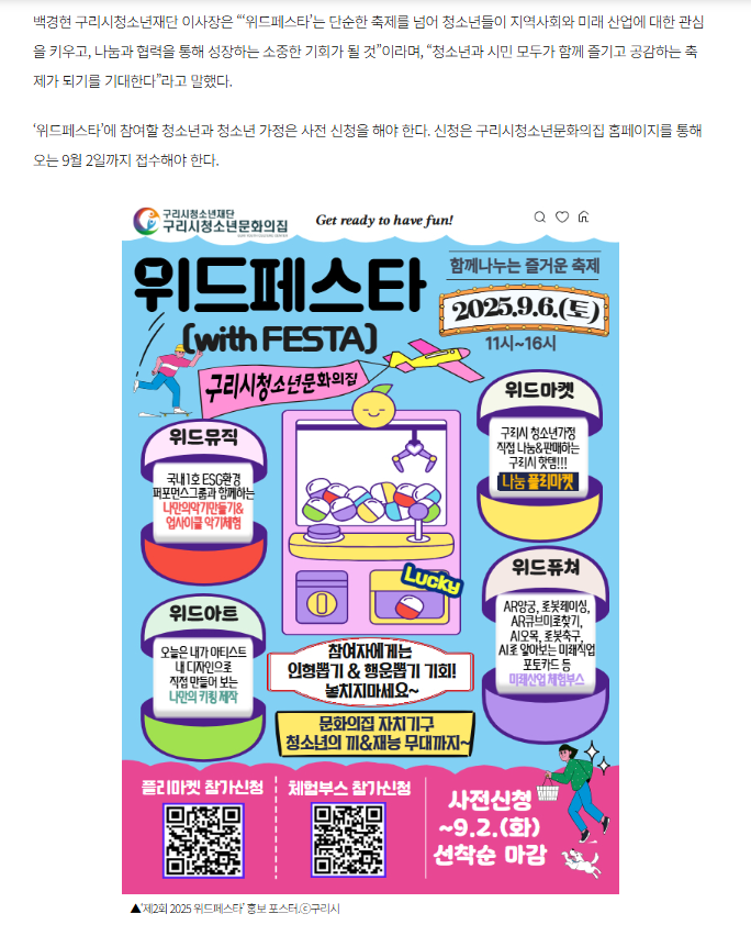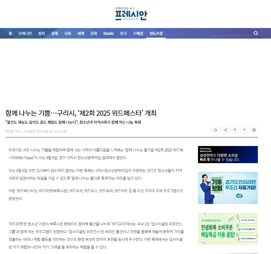 청소년문화의집 함께 나누는 기쁨... 구리시,'제2회 2025 위드페스타'개최 (프레시안 외 10곳) 작성자 김찬영 등록일자 2025년 8월 20일 11시 0분 20초 조회 167 화면 캡처 2025-08-20 105548.png [ Size : 208.9KB , Down : 63 ] 미리보기 다운로드 화면 캡처 2025-08-20 105618.png [ Size : 346.14KB , Down : 62 ] 미리보기 다운로드 목록보기