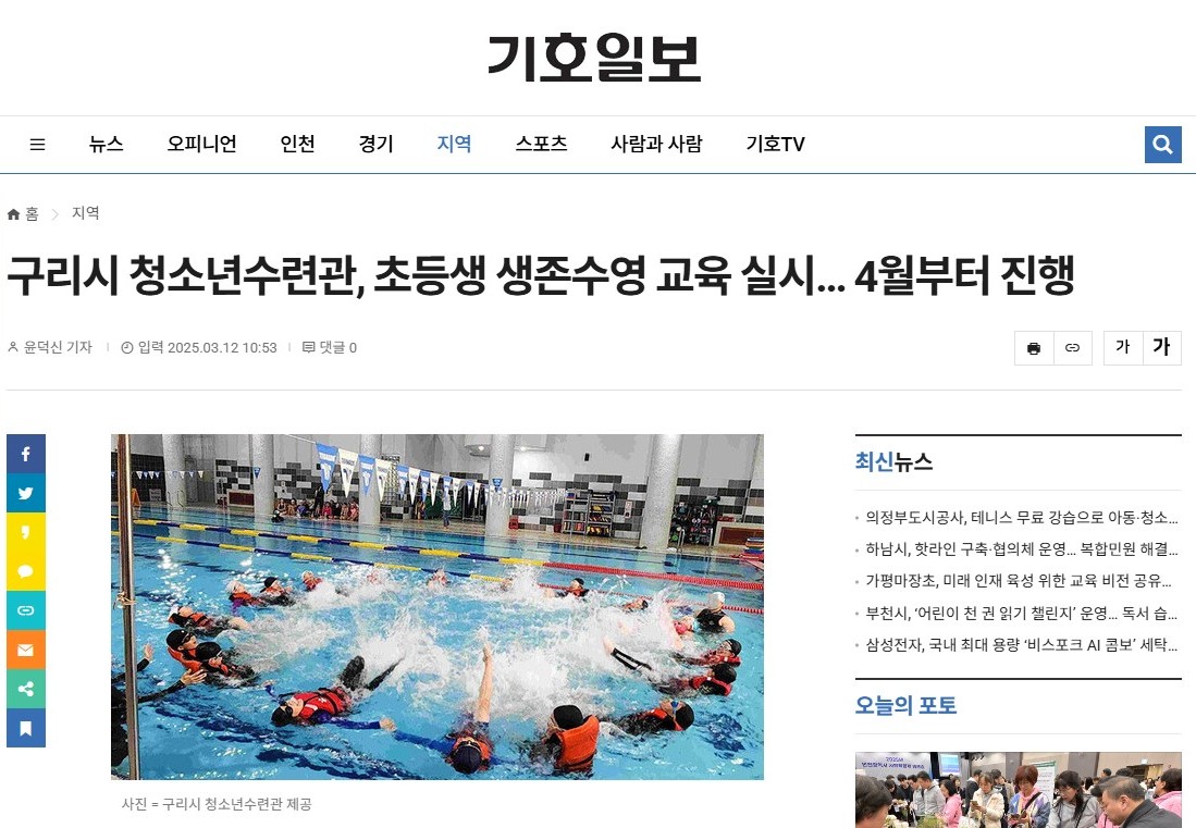 구리시 청소년수련관이 13개 초등학교 3·4학년 1천 800여 명을 대상으로 ‘2025 구리 학생생존수영교육’을 운영한다.