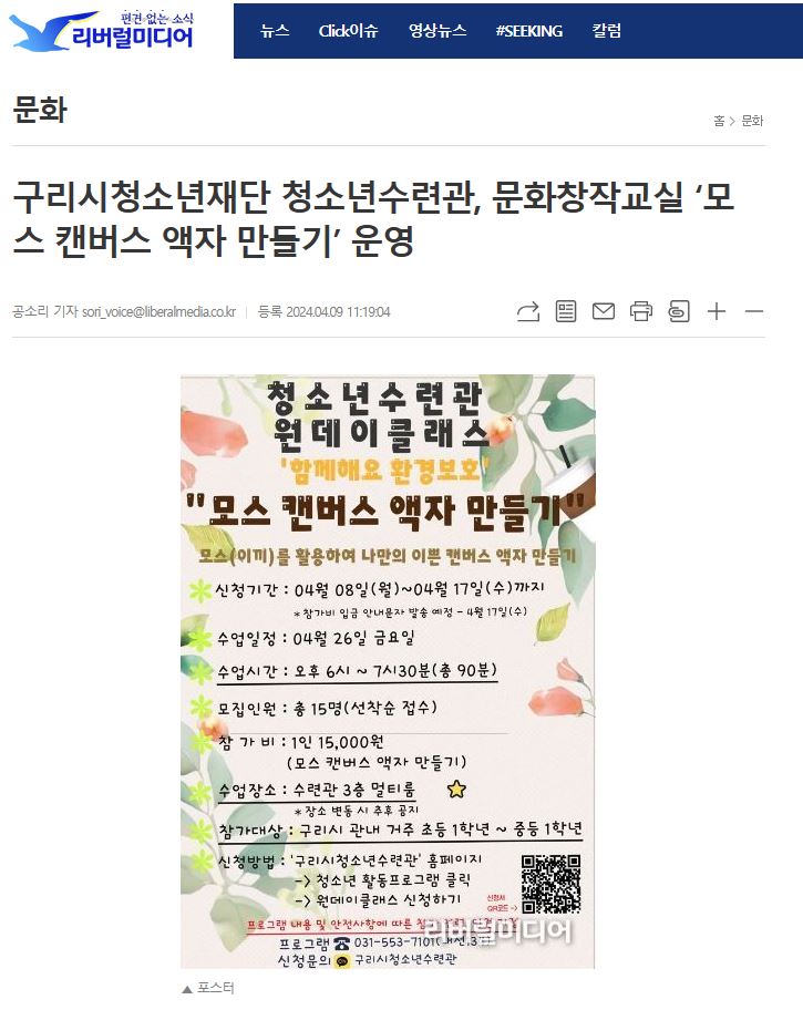 청소년수련관 구리시청소년수련관, 4월 원데이클래스 '모스 캔버스 액자 만들기' 운영(리버럴미디어 외 1곳)