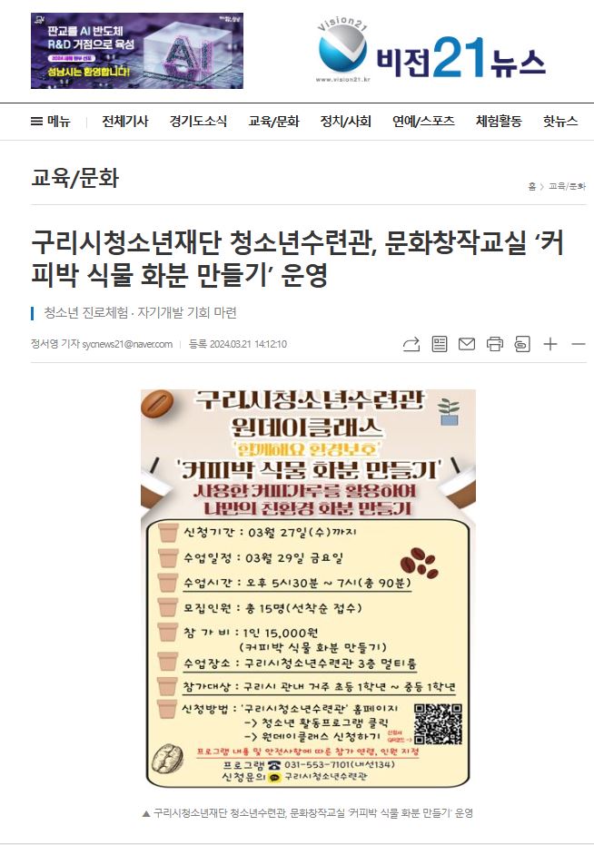청소년수련관 구리시청소년수련관, 3월 원데이클래스 '커피박 식물 화분 만들기' 운영(비전21뉴스 외 2곳)