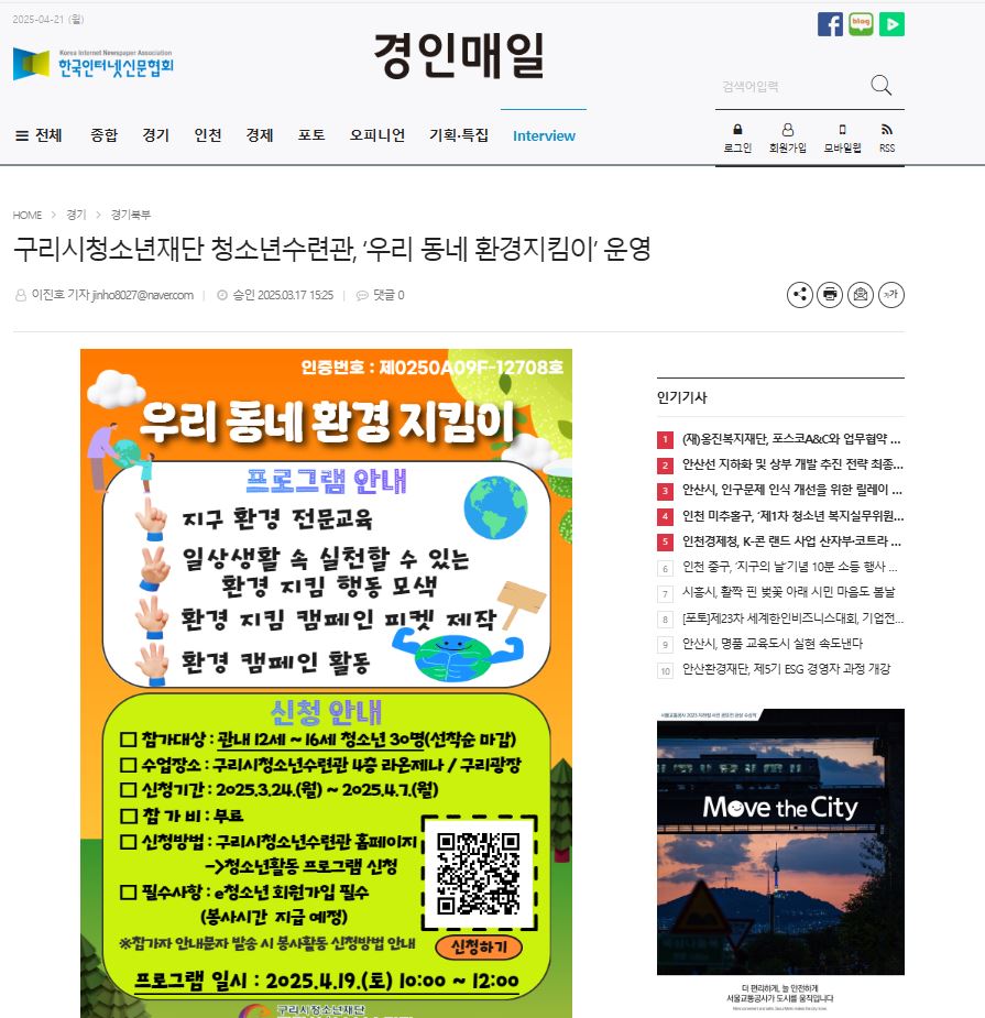 청소년수련관 구리시청소년재단 청소년수련관, '우리 동네 환경지킴이' 운영(경인매일 외 4곳)