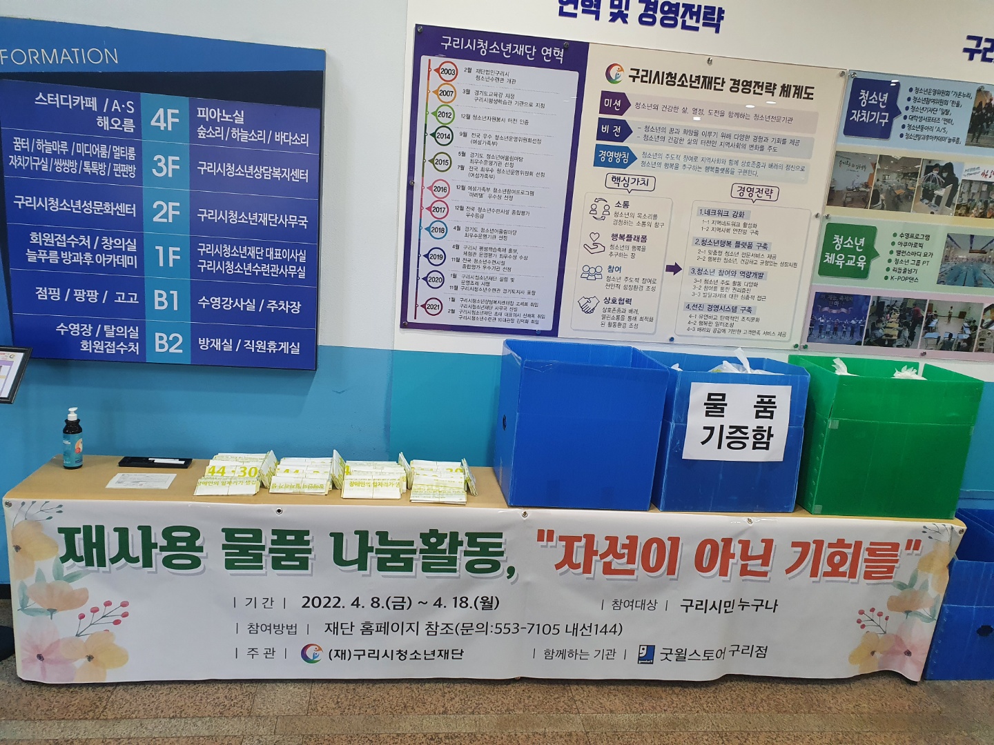 구리시청소년재단(이사장 안승남)은 8일부터 굿윌스토어 구리점과 협력하여 ‘자선이 아닌 기회를’이라는 슬로건으로 재사용 물품 나눔 활동을 진행하고 있다.