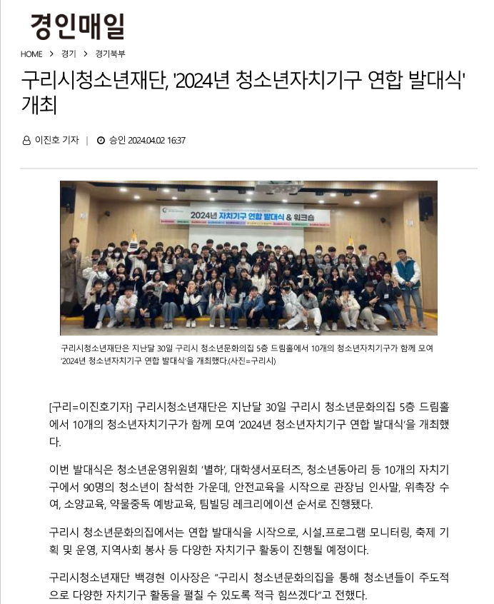 청소년문화의집 구리시청소년재단 구리시청소년문화의집 '2024년 청소년자치기구 연합 발대식' 개최(경인매일 외 3곳) 작성자 김진수 등록일자 2024년 4월 3일 10시 35분 2초 조회 455 구리시청소년문화의집 발대식 보도자료.png [ Size : 333.52KB , Down : 266 ] 미리보기 다운로드 목록보기