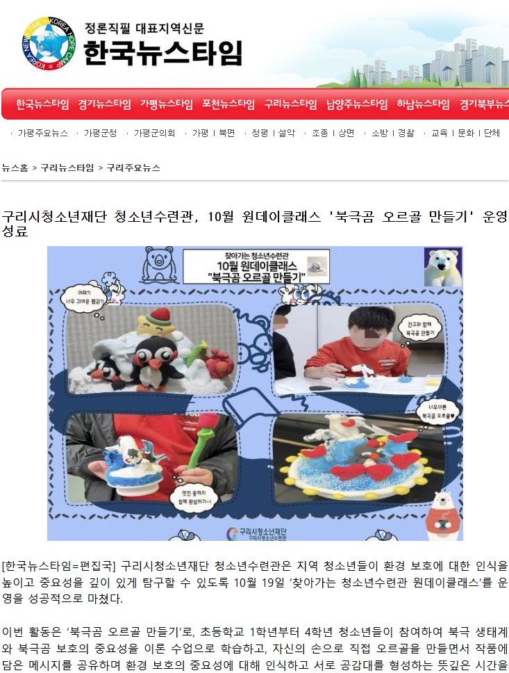 청소년수련관 구리시청소년수련관, 10월 원데이클래스 '북극곰 오르골 만들기' 운영(한국뉴스타임 외 9곳)