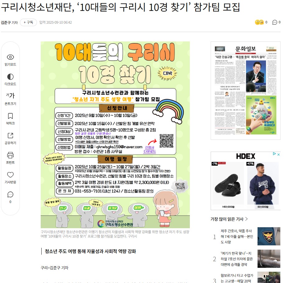 청소년수련관 구리시청소년재단 청소년수련관 , 2025 '10대들의 구리시 10경 찾기' 참가팀 모집(문화일보 외 12곳)