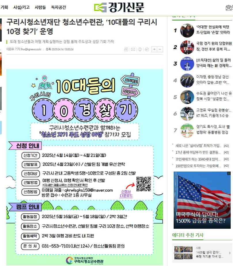 청소년수련관 구리시청소년재단 청소년수련관, 청소년 자기 주도 성장 여행 '10대들의 구리시 10경 찾기' 운영(경기신문 외 10곳)
