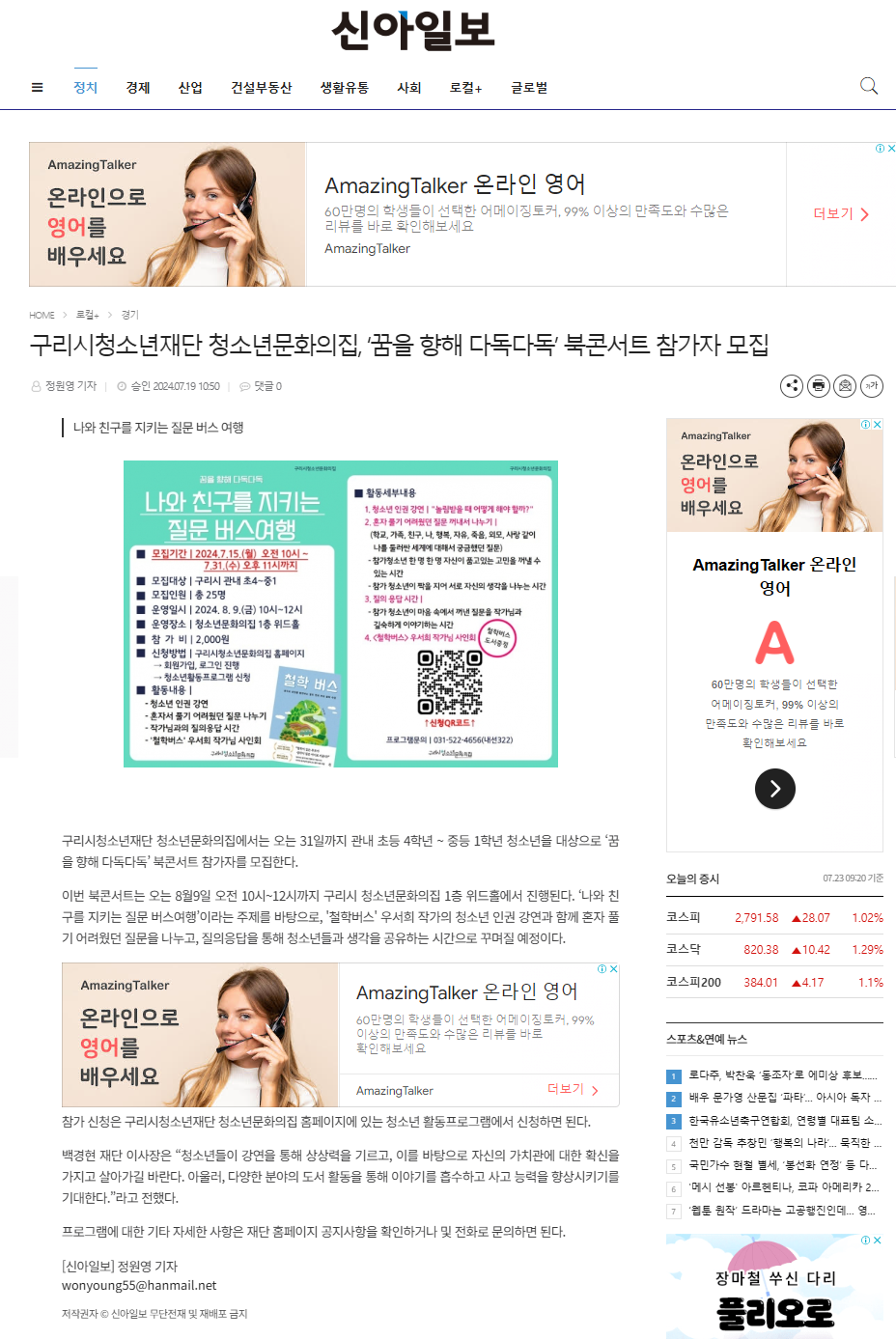 청소년문화의집 구리시청소년재단 청소년문화의집, ‘꿈을 향해 다독다독’ 북콘서트 참가자 모집(신아일보 외 2곳) 작성자 김윤지 등록일자 2024년 7월 23일 9시 22분 23초 조회 286 스크린샷 2024-07-23 092045.png [ Size : 612.77KB , Down : 174 ] 미리보기 다운로드 목록보기