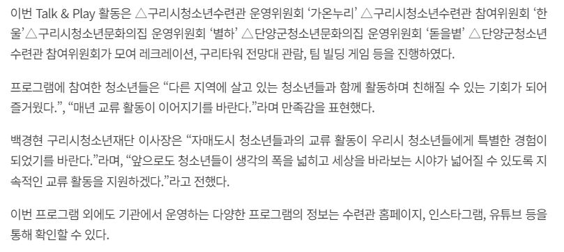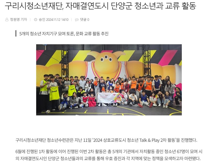 청소년수련관 구리시청소년재단, 자매결연도시 단양군 청소년과 교류 활동 작성자 김재희 등록일자 2024년 11월 14일 10시 0분 50초 조회 264 1.JPG [ Size : 91.05KB , Down : 183 ] 미리보기 다운로드 2.JPG [ Size : 62.12KB , Down : 185 ] 미리보기 다운로드 목록보기