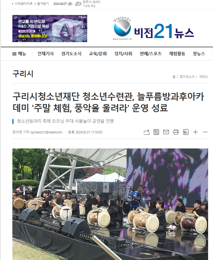 청소년수련관 구리시청소년재단 청소년수련관, 늘푸름방과후아카데미 '주말 체험, 풍악을 울려라' 운영 성료 (비전 21 뉴스 외 7건)