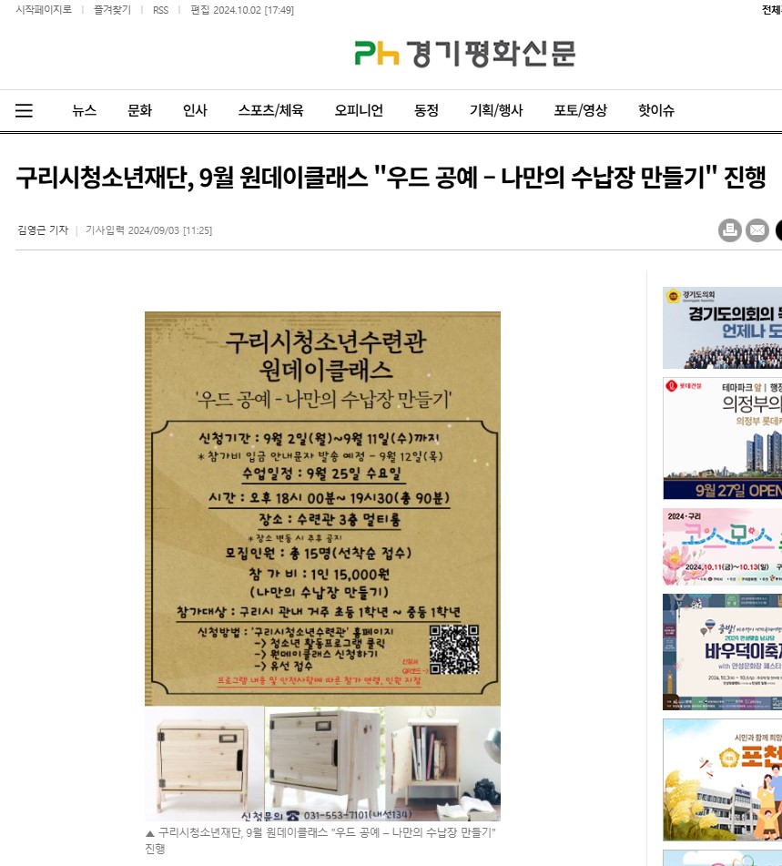 청소년수련관 구리시청소년수련관, 9월 원데이클래스 '나만의 수납장 만들기' 운영(경기평화신문 외 11곳)