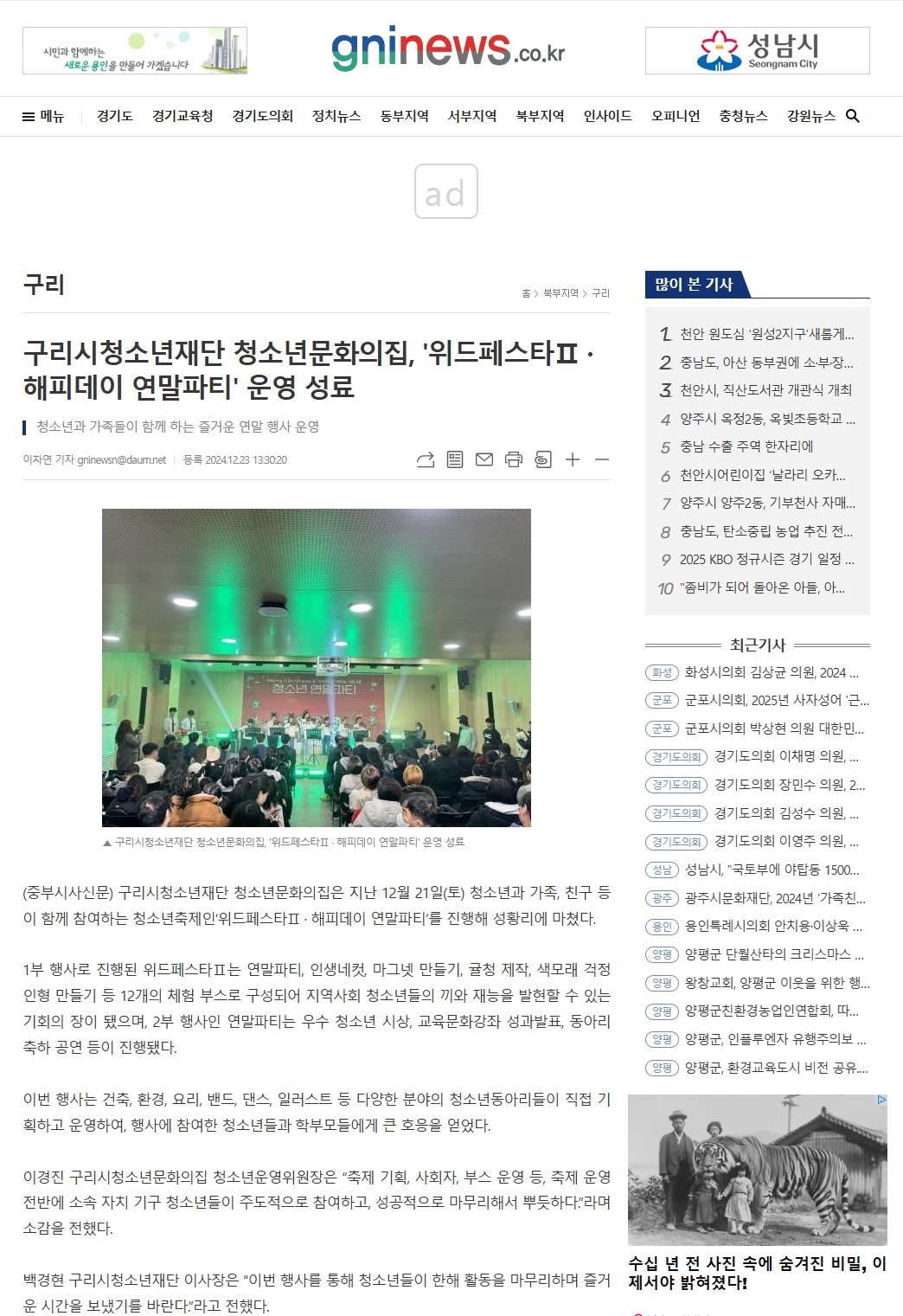 청소년문화의집 구리시청소년재단 청소년문화의집, ‘위드페스타Ⅱ & 해피데이 연말파티’운영 성료 (중부시사신문 외 6곳) 작성자 유병흔 등록일자 2024년 12월 27일 15시 4분 19초 조회 249 1112.jpg [ Size : 419.7KB , Down : 183 ] 미리보기 다운로드 목록보기
