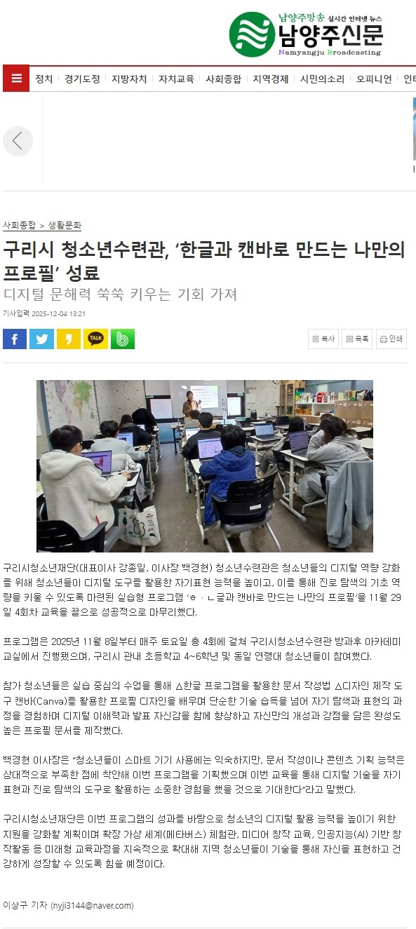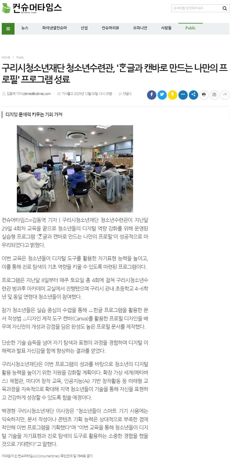 청소년수련관 구리시청소년재단 청소년수련관, '한글과 캔바로 만드는 나만의 프로필' 프로그램 성료 작성자 문서정 등록일자 2025년 12월 5일 10시 1분 34초 조회 13 사후 언론보도-남양주신문.jpg [ Size : 253.4KB , Down : 13 ] 미리보기 다운로드 사후 언론보도-컨슈머타임스.jpg [ Size : 292.17KB , Down : 8 ] 미리보기 다운로드 목록보기