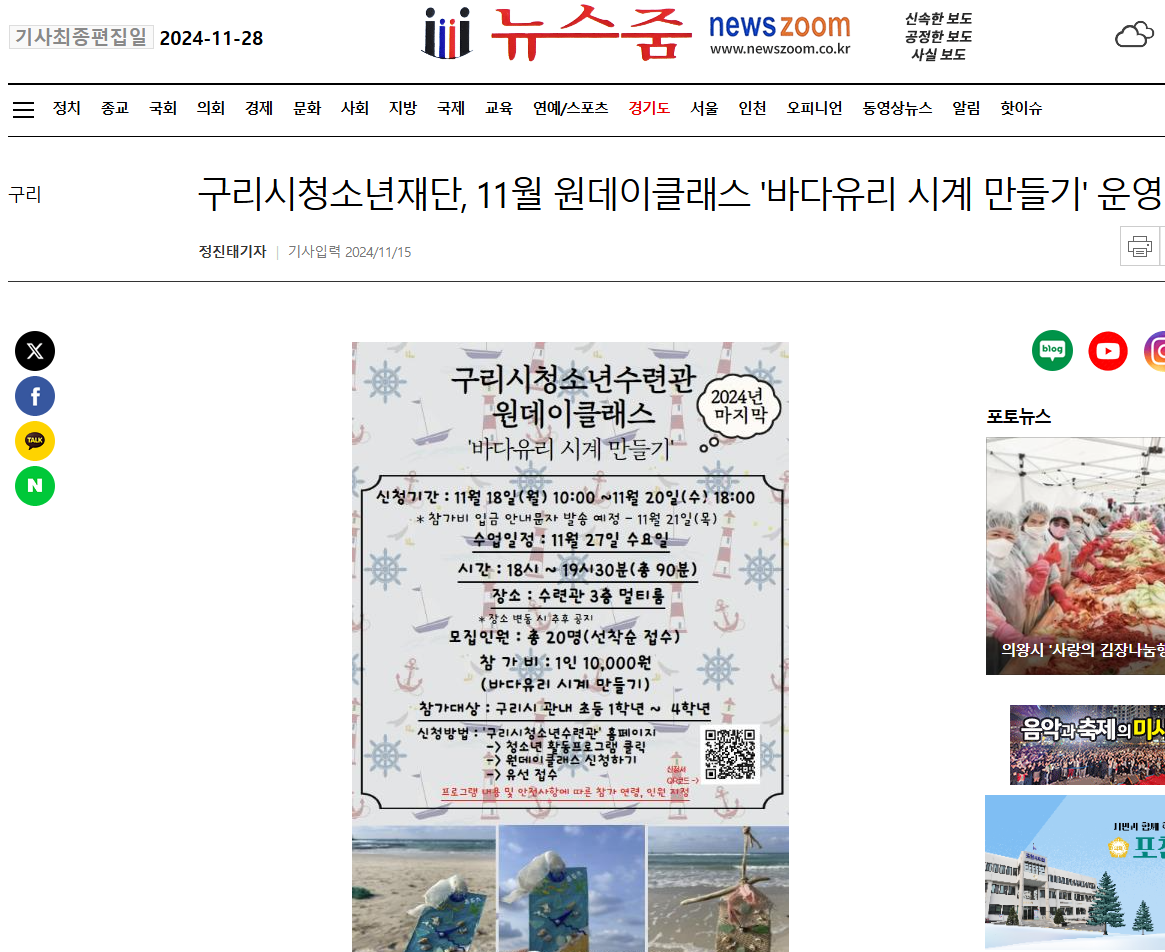 청소년수련관 구리시청소년수련관, 11월 원데이클래스 '바다유리 시계 만들' 운영(뉴스줌 외 6곳)