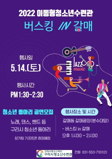 [미디어투데이=안정태 기자] 구리시청소년재단(대표이사 신재옥)은 청소년의 달 5월을 맞아 14일 갈매동 갈매광장에서 '2022 이동형청소년수련관-버스킹 in 갈매' 공연을 개최한다.