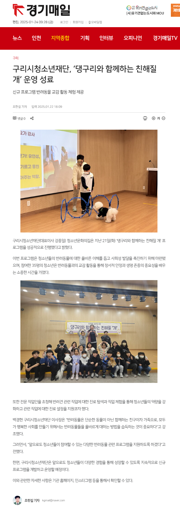 청소년문화의집 구리시청소년재단, 댕구리와 함께하는 친해질 개 운영 성료(경기매일 외 3곳) 작성자 김윤지 등록일자 2025년 1월 24일 9시 40분 26초 조회 220 스크린샷 2025-01-24 094001.png [ Size : 676.84KB , Down : 161 ] 미리보기 다운로드 목록보기