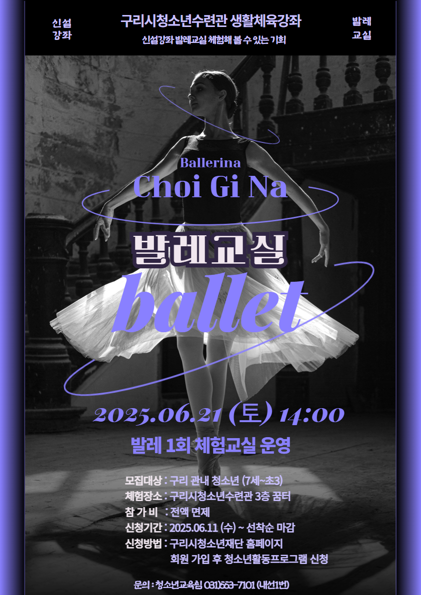 [청소년강좌(발레교실) 1일 체험 안내] 구리시청소년수련관 생활체육강좌 중 신규 개설된 강좌(발레교실)를 체험해 볼 수 있습니다. 청소년의 많은 관심과 참여 부탁드립니다. [청소년강좌(발레교실) 1일 체험] ■ 일 정 : 2025. 6. 21.(토) 14:00 ■ 대 상 : 구리 관내 청소년(7세~초3) ■ 인 원 : 15명 ■ 참 가 비 : 전액 면제 ■ 장 소 : 구리시청소년수련관 3층 꿈터 ■ 신청기간 : 2025. 6. 11.(수) 10:00 ~ 선착순 마감 ■ 모집방법 : 구리시청소년재단 홈페이지(회원가입/참가청소년 이름, 생년월일로 가입하기) → 구리시청소년수련관 → 청소년활동 프로그램 신청 → 청소년강좌 1일 체험 ※ 문의 : 청소년교육팀 031)553-7101(내선1) |