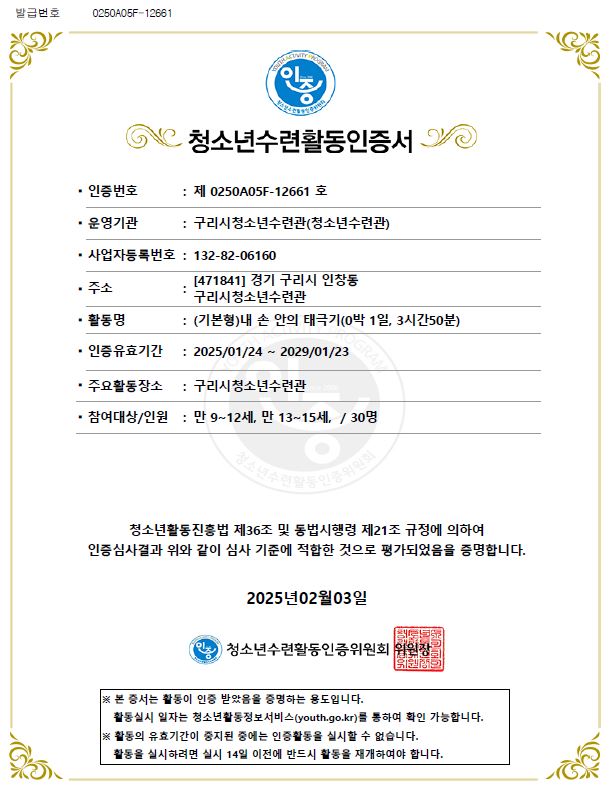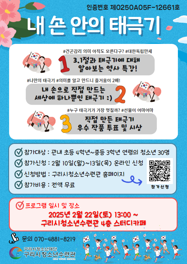 [인증프로그램] 2025 "내 손 안의 태극기" 인증프로그램이란? 청소년이 안전하고 유익한 청소년활동에 참여할 수 있도록 국가가 정한 일정 기준에 따라 심사하여 프로그램을 인증하는 국가인증제도입니다. 구리시청소년재단은 구리시 청소년들의 올바른 역사관의 확립과 3.1절의 의미를 되새길 수 있도록 태극기와 관련된 재미있는 역사 특강을 듣고 직접 태극기를 만들어 볼 수 있는 프로그램을 제공하고자 합니다. 활동 첫번째 _ 3.1절과 태극기에 대해 알아보는 역사 특강! 활동 두번째 _ 내 손으로 직접 만드는 세상에 하나뿐인 태극기 :) 활동 세번째 _ 직접 만든 태극기 우수 작품 투표 및 시상 * 참가 대상 : 구리시 관내 초등4학년~중등3학년 연령에 해당하는 청소년 30명 * 참가 신청 : 2월 10일(월)~13일(목) * 신청 방법 : 구리시청소년수련관 홈페이지 온라인 신청 * 선발 방법 : 1순위) 작년 동일 프로그램 미 참가 청소년 2순위) 1순위 제외 선착순 * 참가 비용 : 전액 무료 * 프로그램 일시 및 장소 : 2025년 2월 22일(토) 12:00~17:00 구리시청소년수련관 4층 스터디카페 많은 참여 부탁드립니다. 문의전화 : 031-553-7101(내선121) |