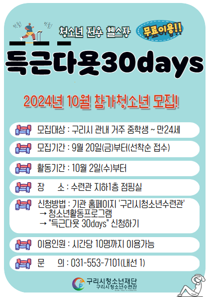 청소년참여주도형<헬스> “득근다욧 30days” 구리시청소년수련관 내에서 청소년 여러분들의 체력증진 및 체형관리를 위해 자율적으로 운동을 계획하고, 참여하는 활동 프로그램입니다. ◆ 준비물 - 개인수건, , 개인운동화(실내에서만 착용) - 물통 - 실내 개인 운동화(필수) / 외부 운동화 및 슬리퍼 착용 금지 ◆ 주의사항 - 개인 물품 이용하기 - 음식물 섭취 금지(단, 생수 제외) ◆ 신청방법 : 구리시청소년수련관 홈페이지→활동프로그램 신청→신청하기 (꼭! 청소년이름 및 이용시간을 체크해서 신청해주세요) ◆ 활동시간표
