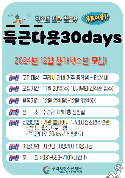 청소년참여주도형<헬스> “득근다욧 30days” 구리시청소년수련관 내에서 청소년 여러분들의 체력증진 및 체형관리를 위해 자율적으로 운동을 계획하고, 참여하는 활동 프로그램입니다. ◆ 준비물 - 개인수건, , 개인운동화(실내에서만 착용) - 물통 - 실내 개인 운동화(필수) / 외부 운동화 및 슬리퍼 착용 금지 ◆ 주의사항 - 개인 물품 이용하기 - 음식물 섭취 금지(단, 생수 제외) ◆ 신청방법 : 구리시청소년수련관 홈페이지→활동프로그램 신청→신청하기 (꼭! 청소년이름 및 이용시간을 체크해서 신청해주세요) ◆ 활동시간표