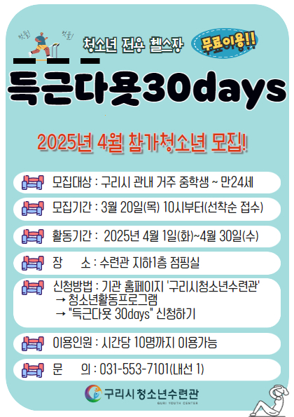 청소년참여주도형<헬스> “득근다욧 30days” 구리시청소년수련관 내에서 청소년 여러분들의 체력증진 및 체형관리를 위해 자율적으로 운동을 계획하고, 참여하는 활동 프로그램입니다. ◆ 준비물 - 개인수건, , 개인운동화(실내에서만 착용) - 물통 - 실내 개인 운동화(필수) / 외부 운동화 및 슬리퍼 착용 금지 ◆ 주의사항 - 개인 물품 이용하기 - 음식물 섭취 금지(단, 생수 제외) ◆ 신청방법 : 구리시청소년수련관 홈페이지→활동프로그램 신청→신청하기 (꼭! 청소년이름 및 이용시간을 체크해서 신청해주세요) ◆ 활동시간표