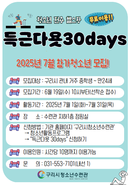 청소년참여주도형<헬스> “득근다욧 30days” 구리시청소년수련관 내에서 청소년 여러분들의 체력증진 및 체형관리를 위해 자율적으로 운동을 계획하고, 참여하는 활동 프로그램입니다. ◆ 준비물 - 개인수건, 개인운동화(실내에서만 착용) - 물통 - 실내 개인 운동화(필수) / 외부 운동화 및 슬리퍼 착용 금지 ◆ 주의사항 - 개인 물품 이용하기 - 음식물 섭취 금지(단, 생수 제외) ◆ 신청방법 : 구리시청소년수련관 홈페이지→활동프로그램 신청→신청하기 (꼭! 청소년이름 및 이용시간을 체크해서 신청해주세요) ◆ 활동시간표