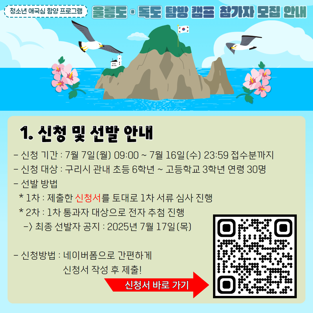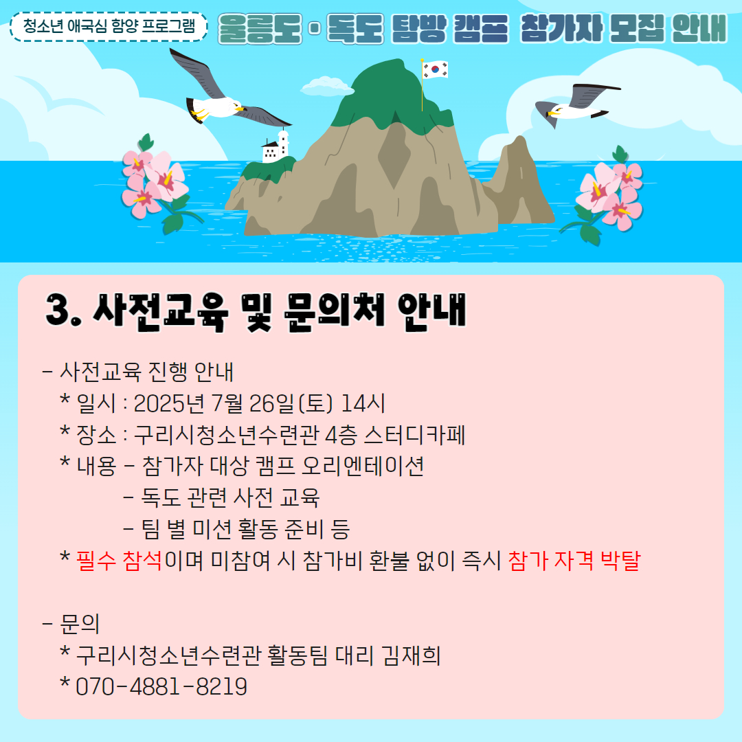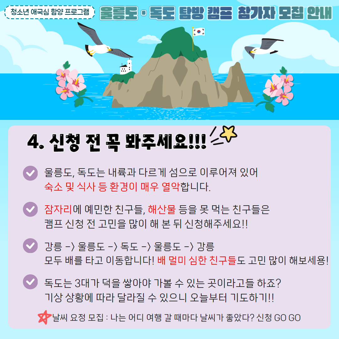 | 프로그램명 | (여기서 신청 X) 2025 청소년 애국심함양 울릉도,독도 체험 캠프 참가자 모집 (공지사항 확인 -> 네이버폼 제출) |