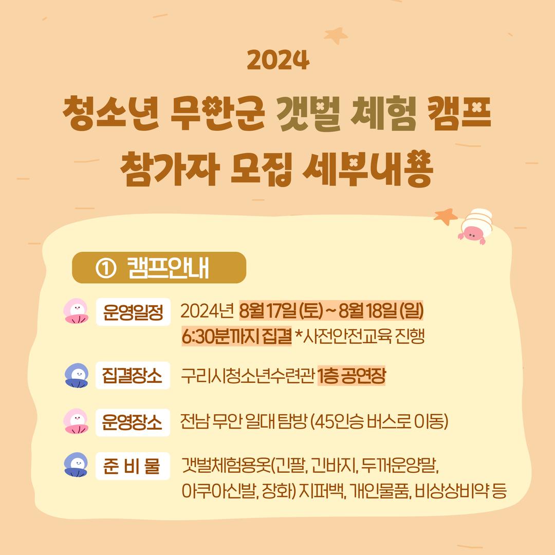 아래 안내 사항을 꼭 읽어주세요! 1. 캠프 안내 운영일정 : 2024년 8월 17일 (토) ~ 8월 18일 (일) 6:30분까지 집결 *사전안전교육 진행 집결장소 : 구리시청소년수련관 1층 공연장 운영장소 : 전남 무안 일대 탐방 (45인승 버스로 이동) 준비물: 갯벌체험용옷(아쿠아슈즈, 장화, 긴팔, 긴바지, 두꺼운양말) 지퍼백, 개인물품, 비상상비약 등 제공물품: 갯벌체험도구, 우비 등 2. 신청 안내 신청기간 : 7월 22일(월) 10:00 ~ 7월 31일(수) 23:59 신청대상 : 구리시 관내 초등 5학년~중등 3학년, 청소년 30명 신청방법 : 구리시청소년수련관홈페이지 → 알림마당 → 청소년활동 프로그램 신청(new) 선정방식 : 1순위 : 구리시청소년수련관 무안캠프 신규 참가자 2순위 : 1순위를 제외한 잔여인원 대상으로 전자추첨 3. 입금 안내 참가비용 : 1인 50,000원 (식사, 간식, 체험활동, 숙소 등 모두 포함) 입금기간 : 8월 1일(목) ~8월 4일(일) ※ 해당 기간 내 미입금 시 참가자격 박탈, 입금기간 이후 보험가입완료로 인한 환불 불가 입금계좌 : 최종 선발자에게 별도 안내 문의 : 031-553-7101 청소년활동팀 방상은 |