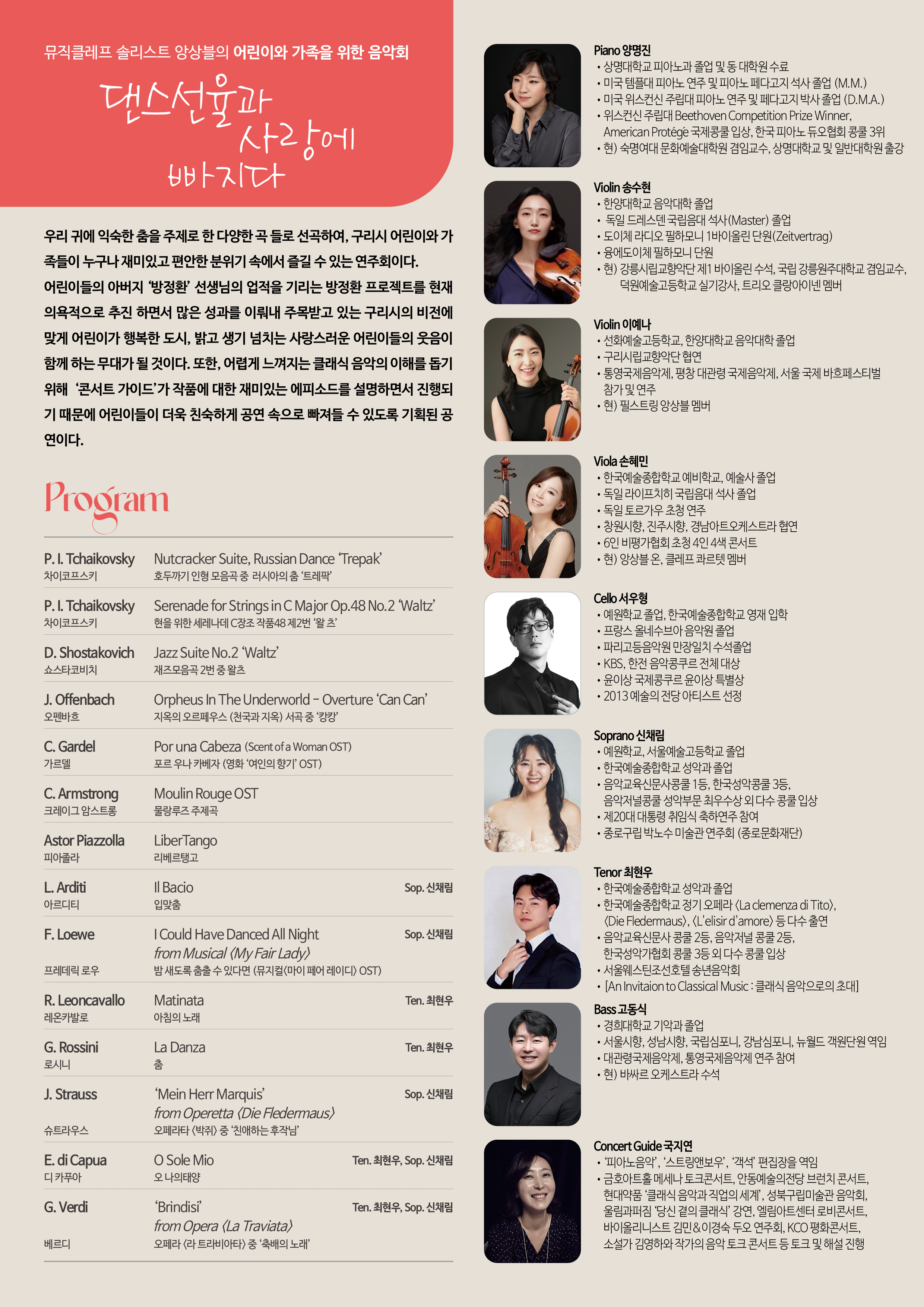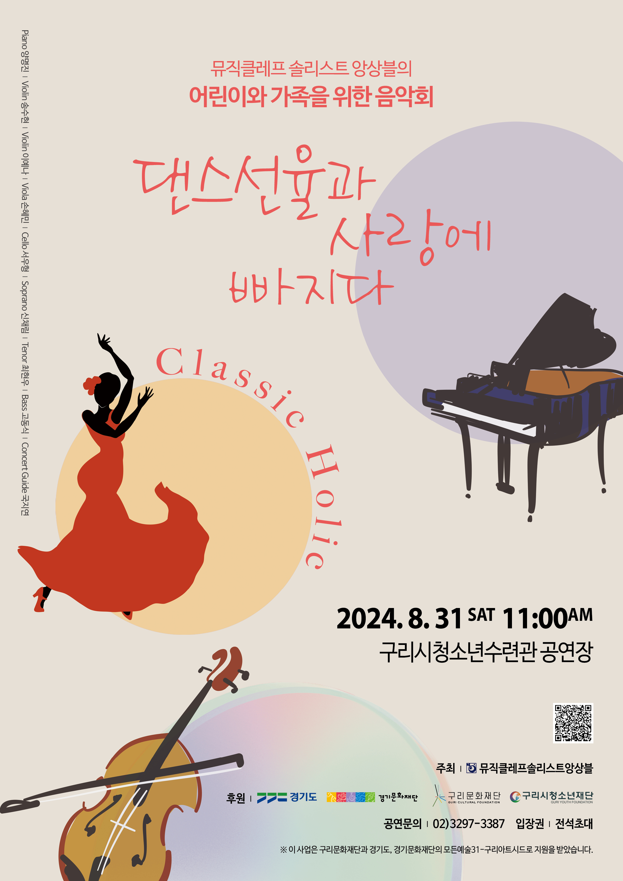 [무료공연] 2024년 구리시청소년재단 사회공헌사업 “클래식홀릭, 댄스선율과 사랑에 빠지다” 음악회 구리시청소년재단은 구리시 청소년들의 건강하고 다양한 활동 프로그램을 통하여 미래시대의 인재 양성을 위하여 최선을 다하고자 합니다. 2024년 뜻깊은 새학기를 시작할 수 있도록 "클래식홀릭, 댄스선율과 사랑에 빠지다." 음악회를 마련하였습니다. 이번 음악회는 우리 귀에 익숙한 춤을 주제로 한 다양한 곡들로 선곡하여 구리시 청소년과 가족들 누구나 재미있고 편안한 분위기 속에서 즐길 수 있는 연주회입니다.