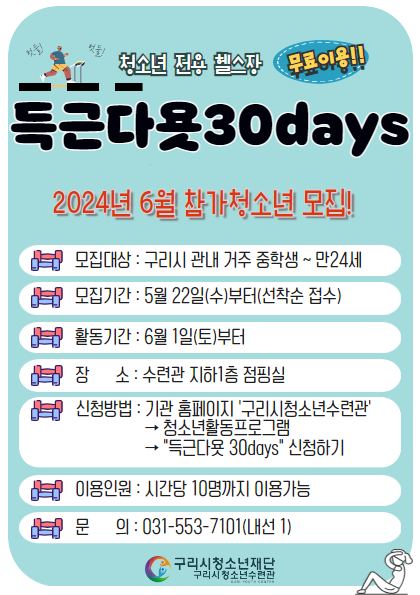 청소년참여주도형<헬스> “득근다욧 30days” 구리시청소년수련관 내에서 청소년 여러분들의 체력증진 및 체형관리를 위해 자율적으로 운동을 계획하고, 참여하는 활동 프로그램입니다. ◆ 준비물 : 개인수건, 물통, 개인운동화(실내에서만 착용) ◆ 주의사항 - 개인 물품 이용하기 - 음식물 섭취 금지(단, 생수 제외) ◆ 신청방법 : 구리시청소년수련관 홈페이지→활동프로그램 신청→신청하기 (꼭! 청소년이름 및 이용시간을 체크해서 신청해주세요) ◆ 활동시간표