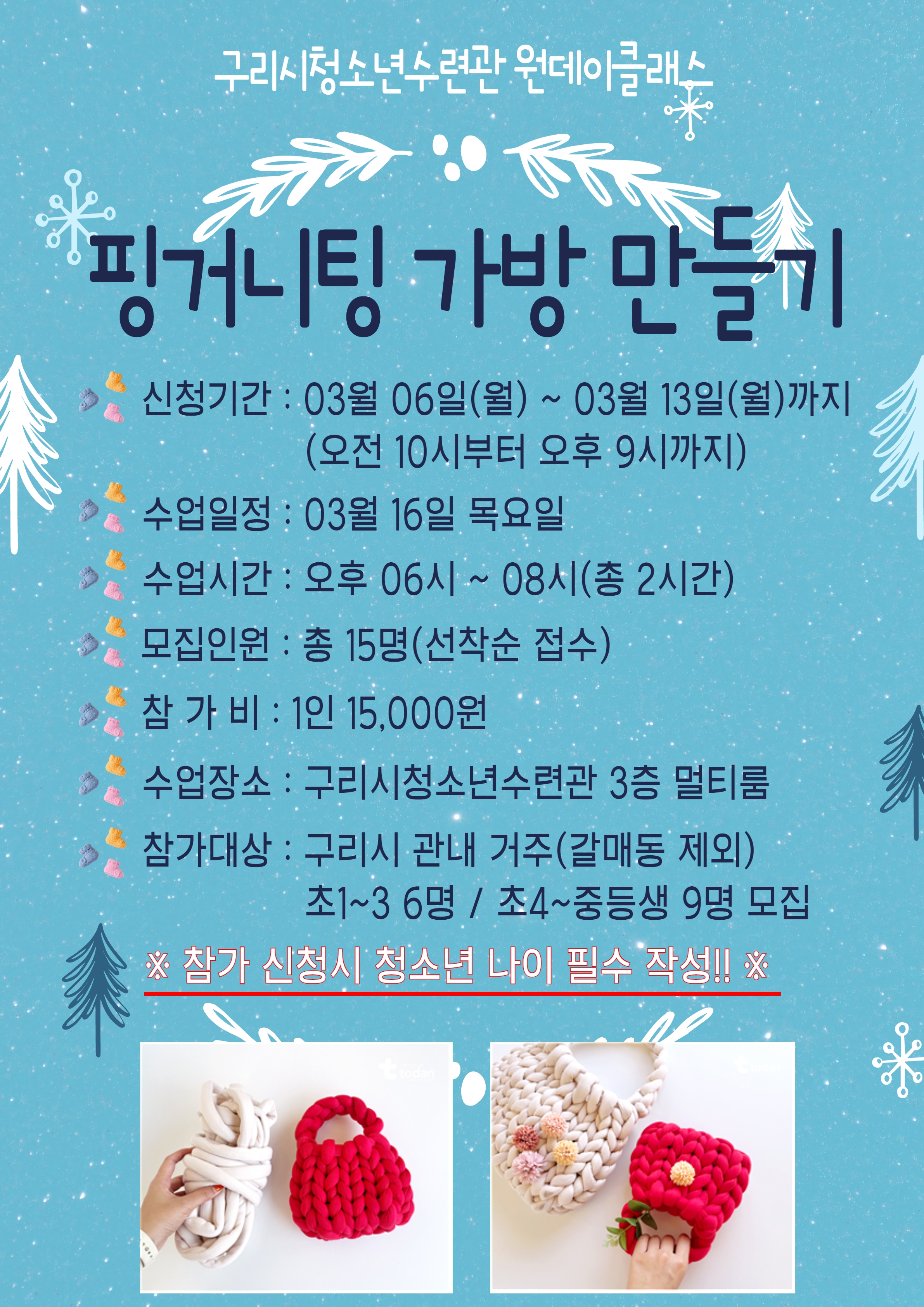 | 프로그램명 | 원데이클래스 "핑거니팅 가방 만들기" *보호자 연락처 필수/갈매동 거주 제외* |