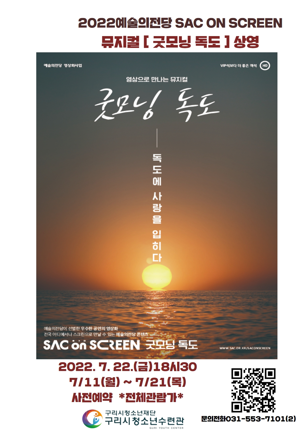 2022 예술의전당 SAC ON SCREEN (삭온스크린) : (Seoul Arts Center on Screen) 삭 온 스크린((영화처럼 공연을 무대 곳곳에서 촬영하여 클로즈업 된 배우의 얼굴, 무대의 뒷모습 등도 볼 수 있도록 하는 예술의 전당 영상화 사업)) [7월 공연일정] # 뮤지컬 [굿모닝 독도] 7월22일 오후6시30분 (*신청자 최소인원 20명이상시 운영됩니다.) |
