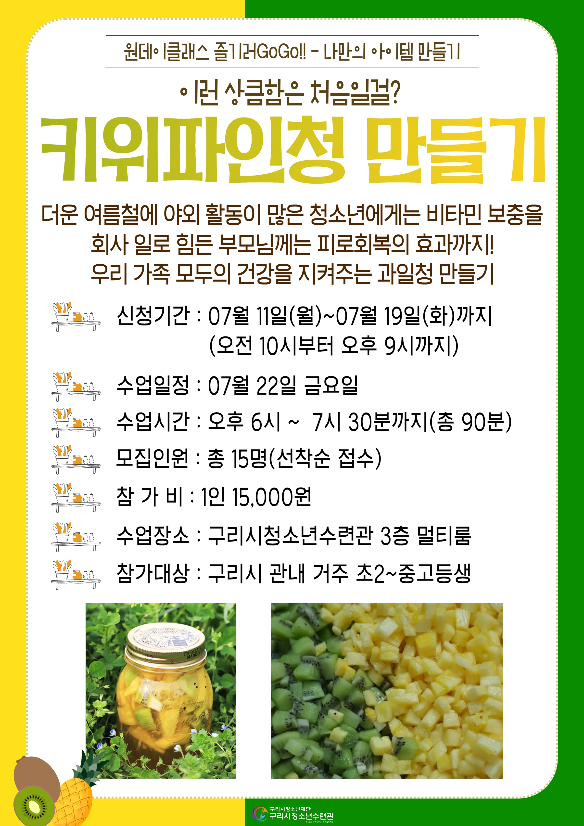 | 프로그램명 | 2022 원데이클래스 즐기러 GoGo! < 키위파인청 만들기 > *보호자 연락처 필수* |