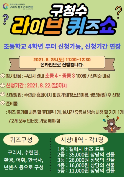 * 구리시, 수련관, 환경, 어휘, 한국사, 넌센스 등의 주제로 구성된 온라인 실시간 퀴즈쇼! *시상안내 - 각 1명 - 1등 : 갤럭시 버즈 라이브 - 2등 : 35,000원 상당의 상품 - 3등 : 26,000원 상당의 상품 - 4등 : 16,000원 상당의 상품 - 5등 : 11,000원 상당의 상품 * 참가자 모집 완료 후 개별 안내 예정입니다. 따라서 회원가입시 입력한 참가자 연락처와 프로그램 신청시 입력한 보호자 연락처에 오타가 없도록 작성 바랍니다. * 프로그램 당일 불참 시 향후 수련관 프로그램 참여가 제한 될 수 있습니다. |