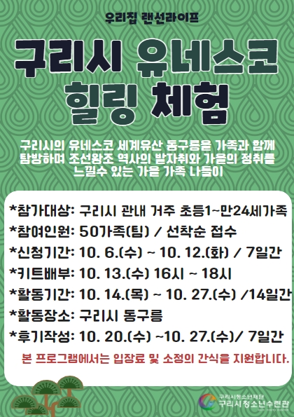 ■ 구리시의 유네스코 세계유산 동구릉을 가족들과 함께 탐방하여 조선왕조 역사의 발자취와 가을의 정취를 느낄수 있는 가을 가족 나들이를 준비하였습니다. ■ 활동내용 1. 유네스코 세계유산 구리시 동구릉 탐방 2. 광대한 숲 동구릉을 도보로 미션 수행 ★ 구리시 동구릉이라고 부르는 이유? ★ 구리시 동구릉이 유네스코로 지정된 이유? 3. 동구릉을 탐방 후(역사배우기 및 걷기활동) 후기 및 댓글 작성 - 사진(미션의 답에 맞는 상징물, 의미, 배경)을 담은 사진 - 방문확인서 1부(필수) ※ 본 프로그램에서는 입장료 및 소정의 간식을 지원합니다 ■ 동구릉 탐방 후 함께한 소중한 사진과 느낀점 등 밴드에 후기와 댓글을 꼭!꼭!남겨주세요 ※ 소중한 후기와 사진, 방문확인서 1부는 필수이며, 우수 댓글 심사에 따라 상품이 지급됨을 알려드립니다. |