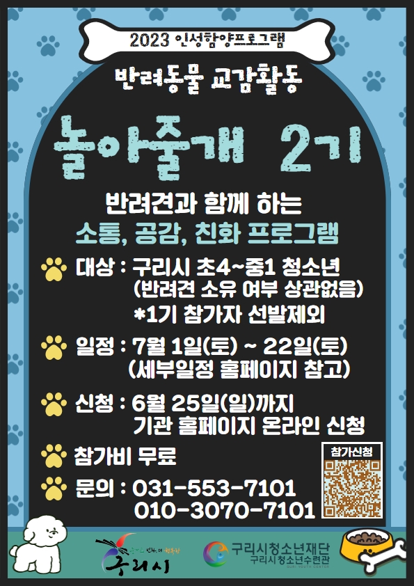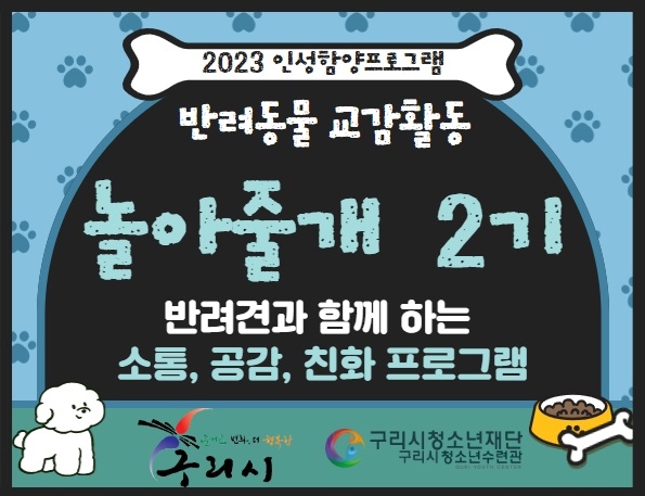 2. 프로그램 세부 내용 #전문교육을 받은 반려견과 함께 하는 소통,공감,친교활동 - 1교시 : 반려견과 친밀감 다지기 - 2교시 : 반려견과 볼링놀이, 빙고게임 - 3교시 : 반려견과 소통놀이 - 4교시 : 반려견과 추억나누기 3. 참가대상 : 구리시 거주 또는 재학중인 초등 4학년~중등1학년 청소년 20명 #본인 반려견 동반활동 아니며, 반려견 양육여부와 상관없이 참여가능