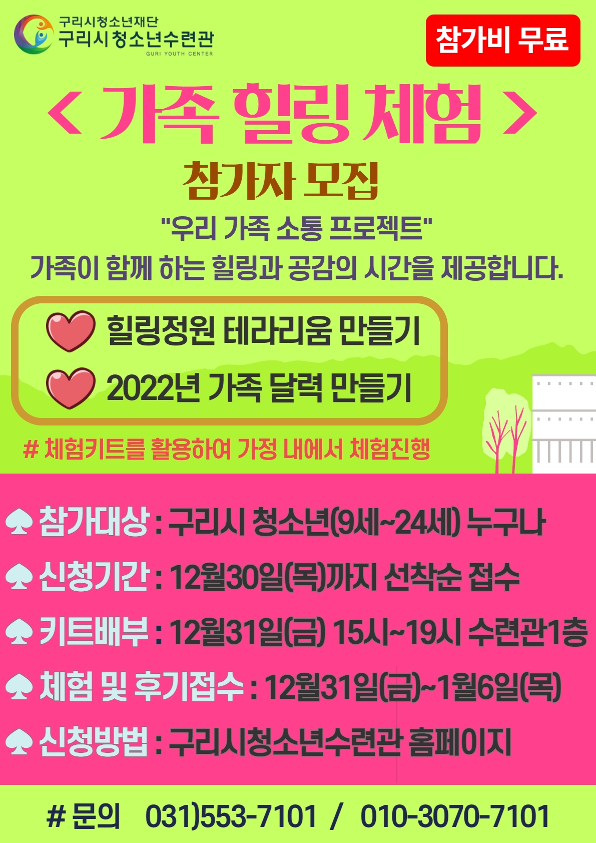 3. 참가비 : 무료 4. 체험 일정 - 키트 수령후 1월6일(목)까지 가정 내에서 개별체험 - 활동영상 제공 5. 사전 물품 수령 - 배부일정 : 12월 31일(금) 오후3시~오후7시 - 배부장소 : 구리시청소년수련관 1층 6. 체험후기 접수 - 우수체험 후기 선정하여 푸짐한 상품 제공 - 제출기간 : 1월 6일(목)까지 - 제출방법 : 네이버밴드 '구리시청소년재단' ( 가입링크 : https://band.us/n/ada66330E55e1 )