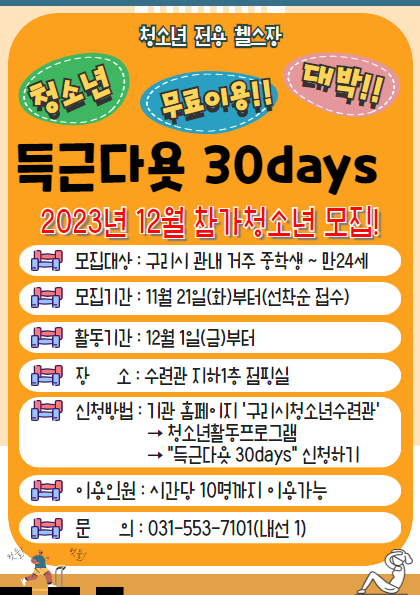 구리시청소년수련관 내에서 청소년 여러분들의 체력증진 및 체형관리를 위해 자율적으로 운동을 계획하고, 참여하는 활동 프로그램입니다.