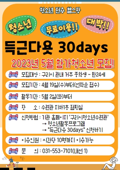 청소년참여주도형<헬스> “득근다욧 30days” 구리시청소년수련관 내에서 청소년 여러분들의 체력증진 및 체형관리를 위해 자율적으로 운동을 계획하고, 참여하는 활동 프로그램입니다. ◆ 준비물 : 개인수건, 물통, 개인운동화(실내에서만 착용) ◆ 주의사항 - 코로나19 확산 방지를 위해 마스크 착용 필수 - 개인 물품 이용하기 - 코로나19로 인한 샤워 이용 불가 - 음식물 섭취 금지(단, 생수 제외) ◆ 신청방법 : 구리시청소년수련관 홈페이지→활동프로그램 신청→신청하기 (꼭! 청소년이름 및 이용시간을 체크해서 신청해주세요) ◆ 활동시간표
