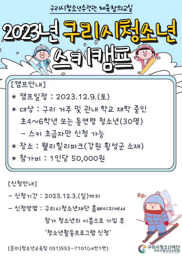 | 프로그램명 | 2023 구리시 청소년 스키캠프(추첨제) |