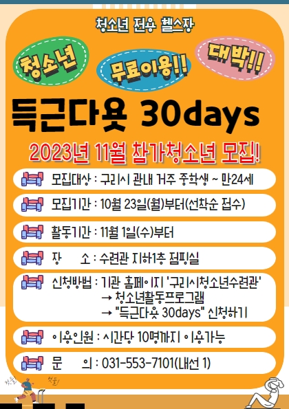 청소년참여주도형<헬스> “득근다욧 30days” 구리시청소년수련관 내에서 청소년 여러분들의 체력증진 및 체형관리를 위해 자율적으로 운동을 계획하고, 참여하는 활동 프로그램입니다. ◆ 준비물 : 개인수건, 물통, 개인운동화(실내에서만 착용) ◆ 주의사항 - 개인 물품 이용하기 - 음식물 섭취 금지(단, 생수 제외) ◆ 신청방법 : 구리시청소년수련관 홈페이지→활동프로그램 신청→신청하기 (꼭! 청소년이름 및 이용시간을 체크해서 신청해주세요) ◆ 활동시간표