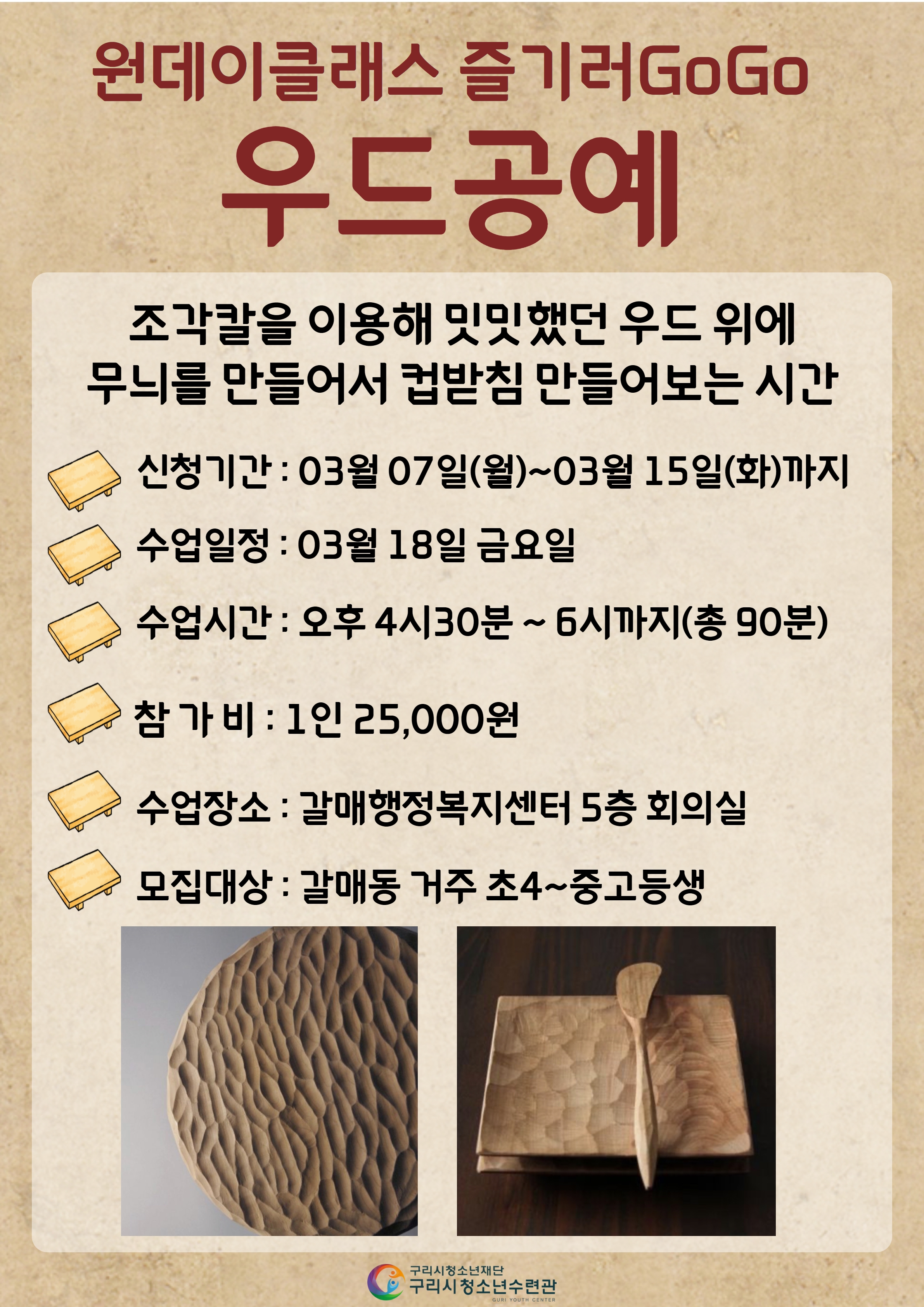 | 프로그램명 | 2022 원데이클래스 즐기러 GoGo! < 세번째, 우드공예 > *갈매동거주/보호자 연락처 필수* |