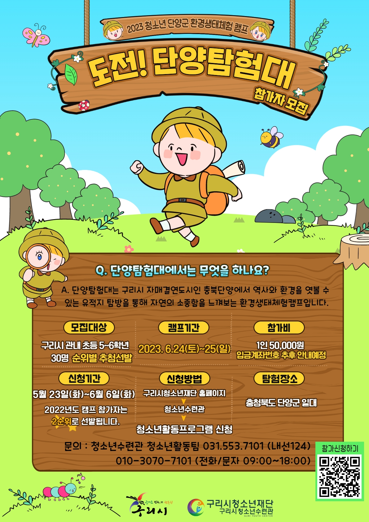 1. 신청안내 - 신청기간 : 5월 23일 09:00 ~ 6월 6일 23:59 - 신청대상 : 구리시 거주 또는 재학중인 12세~13세 청소년 30명 - 선발방법 : 선착순 (추가모집) - 신청방법 : 온라인 신청 *참가자 선정 후 개인정보수집(보험가입용)을 위하여 선발 후 참가신청서를 재작성 예정* 2. 캠프안내 - 운영일정 사전모임 : 6월 23일(금) / 수련관에서 진행 캠프운영 : 6월 24일(토)~25일(일) / 1박2일 - 운영장소 :충청북도 단양군 일대 - 주요활동 : 도담삼봉, 고수동굴, 단양다누리아쿠아리움, 수양개선사유물전시관 관람 3. 참가비용 : 1인 5만원(*입금계좌 추후안내) 4. 사전활동 안내 - 캠프 사전안내 및 교육을 위하여 참가자 및 보호자 중 1인 이상 필수참석 - 운영일정 : 6월 23일(금) 17:00~18:00 - 운영장소 : 구리시청소년재단 1층 공연장 - 운영내용 : 참가자 및 보호자 대상 캠프 오리엔테이션 및 사전교육 진행 5. 문의 - 구리시청소년수련관 청소년활동팀 - Tel : 031)553-7101 / 내선124 - H.P : 010-3070-7101 (전화/문자 09:00~18:00) *본 청소년캠프는 청소년수련활동신고를 완료한 청소년활동프로그램입니다. |