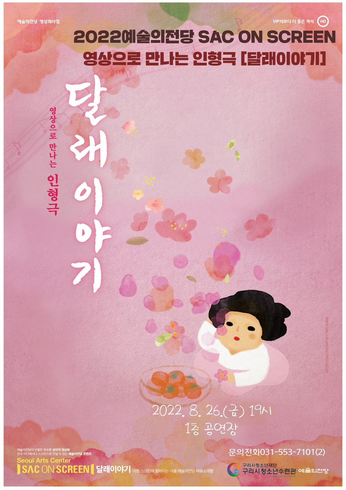 2022 예술의전당 SAC ON SCREEN (삭온스크린) : (Seoul Arts Center on Screen) 삭 온 스크린((영화처럼 공연을 무대 곳곳에서 촬영하여 클로즈업 된 배우의 얼굴, 무대의 뒷모습 등도 볼 수 있도록 하는 예술의 전당 영상화 사업)) [8월 공연일정] # 영상으로 만나는 인형극 [달래이야기] 8월26일 오후7시 (상영시간 55분) (*신청자 최소인원 20명이상시 운영됩니다.)