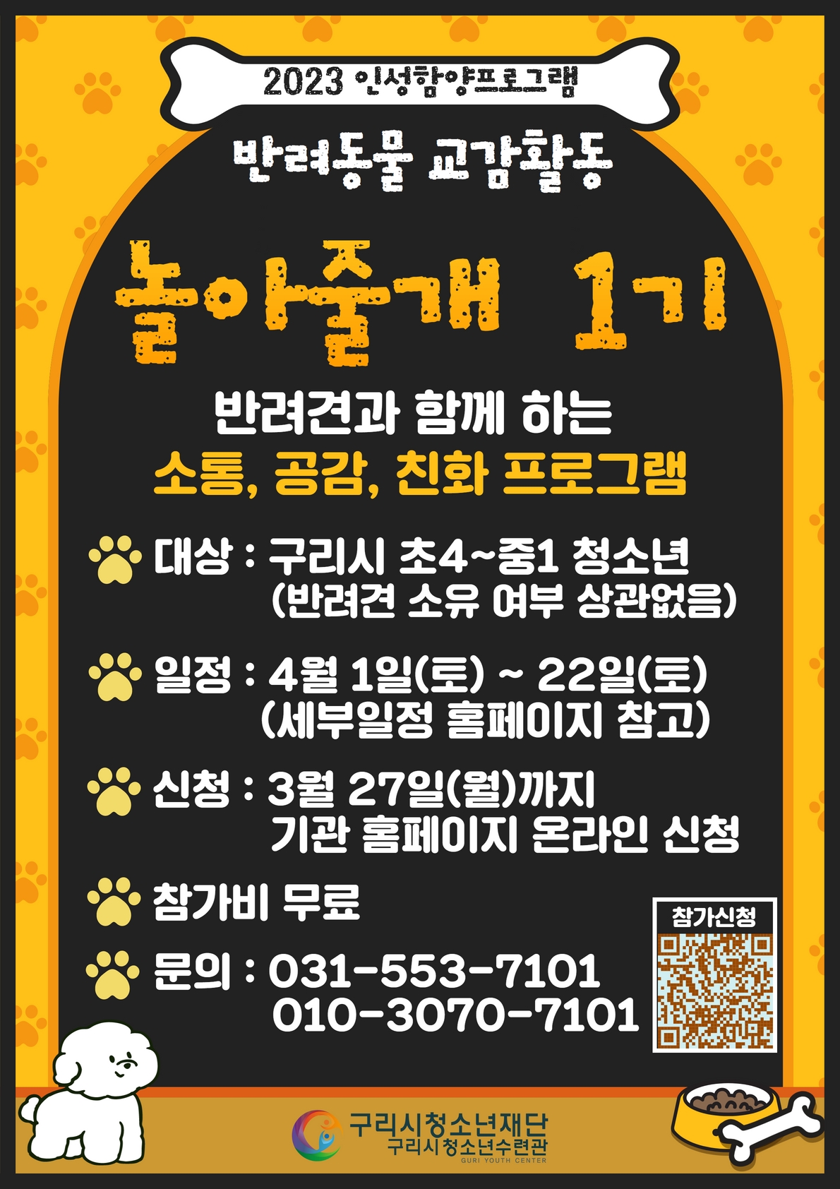 4. 참가비 : 무료 5. 활동장소 - 1~3교시 : 구리시청소년재단 청소년수련관 3층 꿈터 - 4교시 : 갈매동 반려견학교(단체버스 이동)