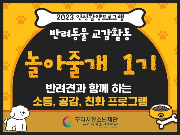 2. 프로그램 세부 내용 #전문교육을 받은 반려견과 함께 하는 소통,공감,친교활동 - 1교시 : 반려견과 친밀감 다지기 - 2교시 : 반려견과 볼링놀이, 빙고게임 - 3교시 : 반려견과 소통놀이 - 4교시 : 반려견과 추억나누기 3. 참가대상 : 구리시 거주 또는 재학중인 초등 4학년~중등1학년 청소년 #본인 반려견 동반활동 아니며, 반려견 양육여부와 상관없이 참여가능