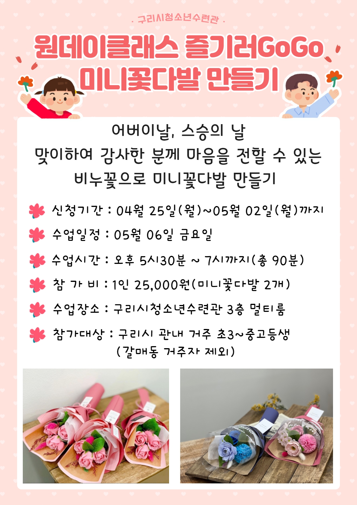 | 프로그램명 | 2022 원데이클래스 즐기러 GoGo! < 미니꽃다발 만들기 > *갈매지역제외/보호자 연락처 필수* |