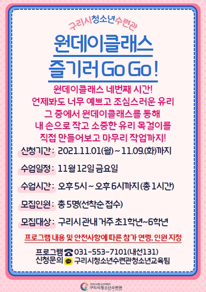 | 프로그램명 | 원데이클래스 즐기러 GoGo! < 네번째, 유리공예 - 1차시 수업 > *보호자 연락처 필수 기재* |