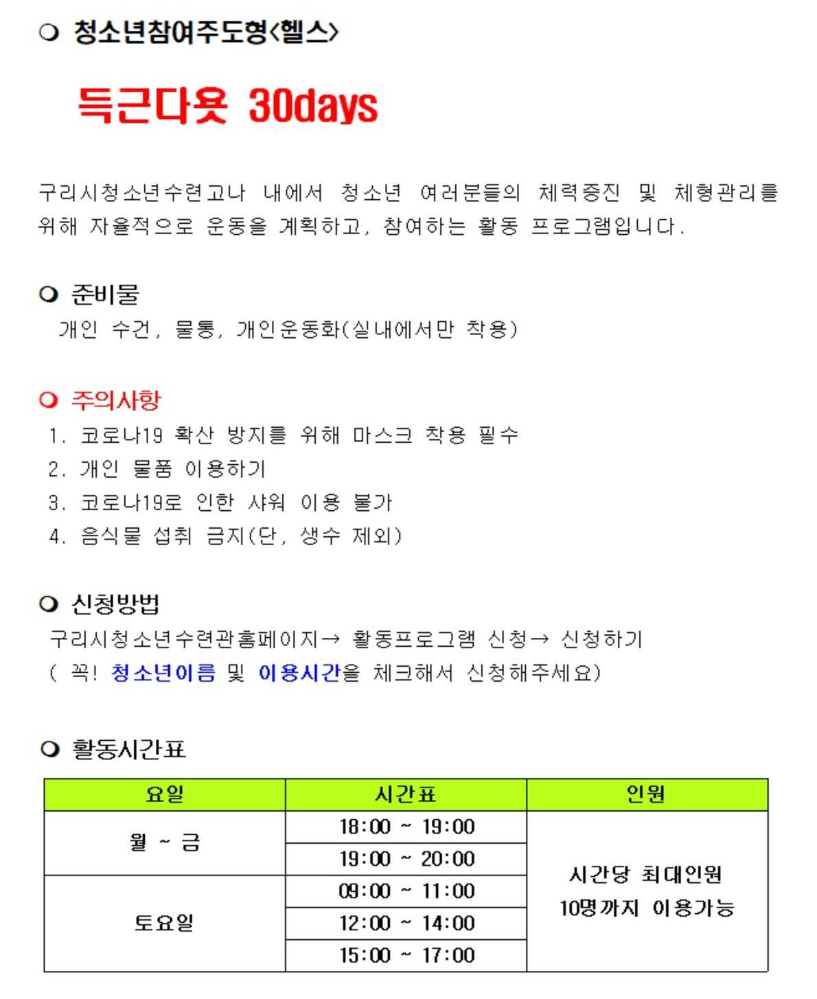 | 프로그램명 | 득근다욧 30Days * 이용시간 필수작성!! * |