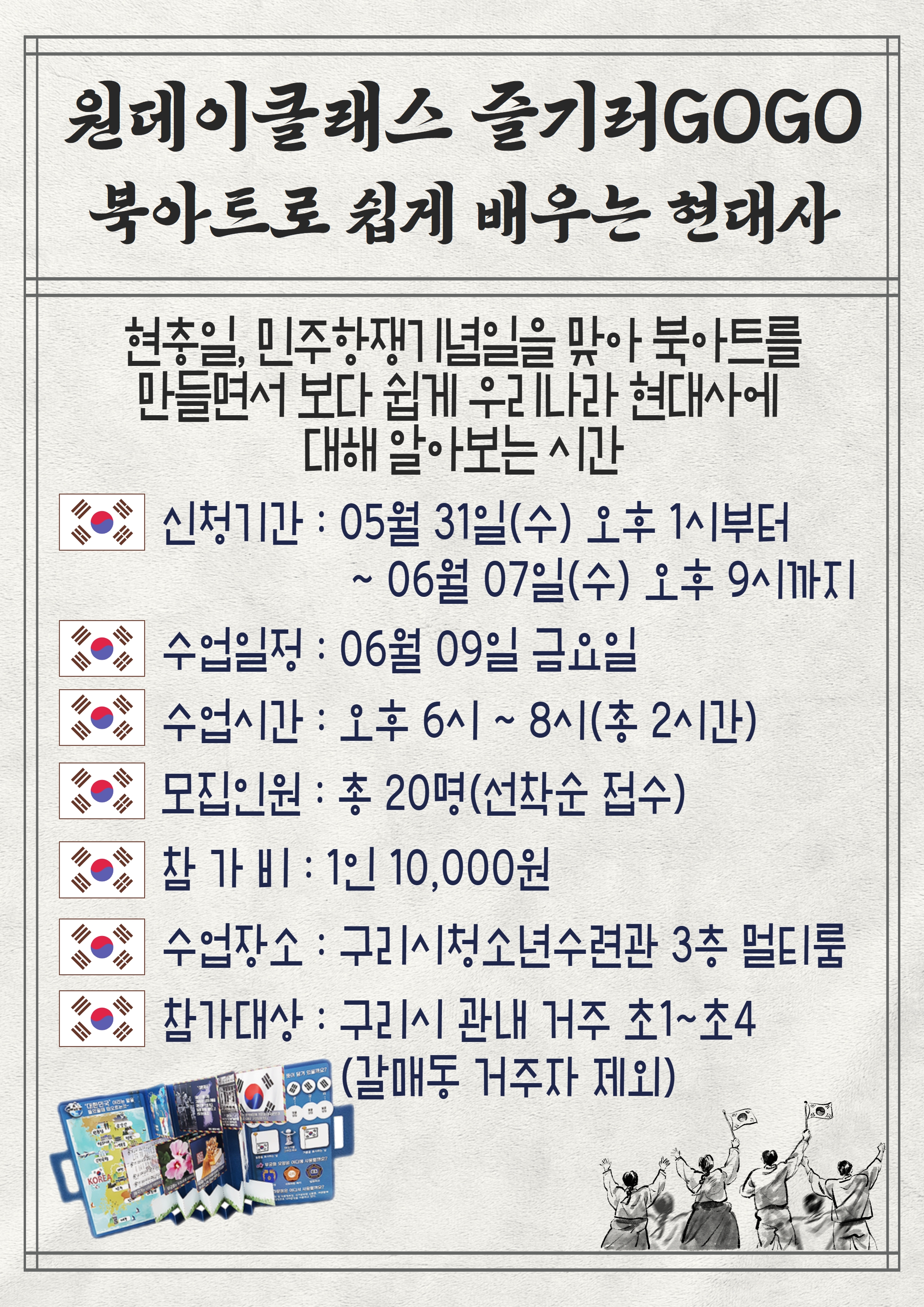 | 프로그램명 | 원데이클래스 "북아트로 쉽게 배우는 현대사" *보호자 연락처 필수/갈매동 거주 제외* |