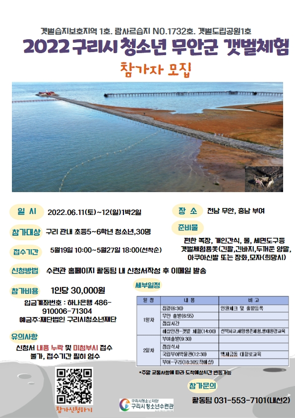 | 프로그램명 | 2022 구리시 청소년 무안군 갯벌체험 참가자 모집 (*첨부파일-신청서 작성후 메일전송) |